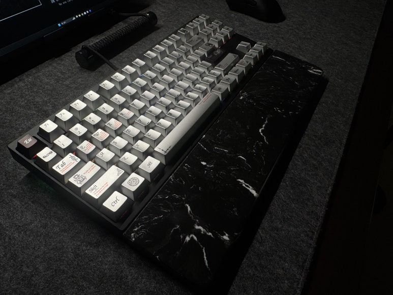 키캡변경에 맞춰 금속의 시크한 감성을 살리기 위해 팜레스트와 배경화면도 블랙톤으로 변경했습니다.